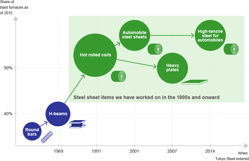 To that end, we believe we must lead the effort, as we are the electric arc furnace steel manufactuer that has boldly taken on challenges to produce “blast furnance items,” such as H-beams and steel sheets, which electric arc furnace steel manufacturers traditionally have not produced, and we have widely supplied electric arc furnace steel products to society.